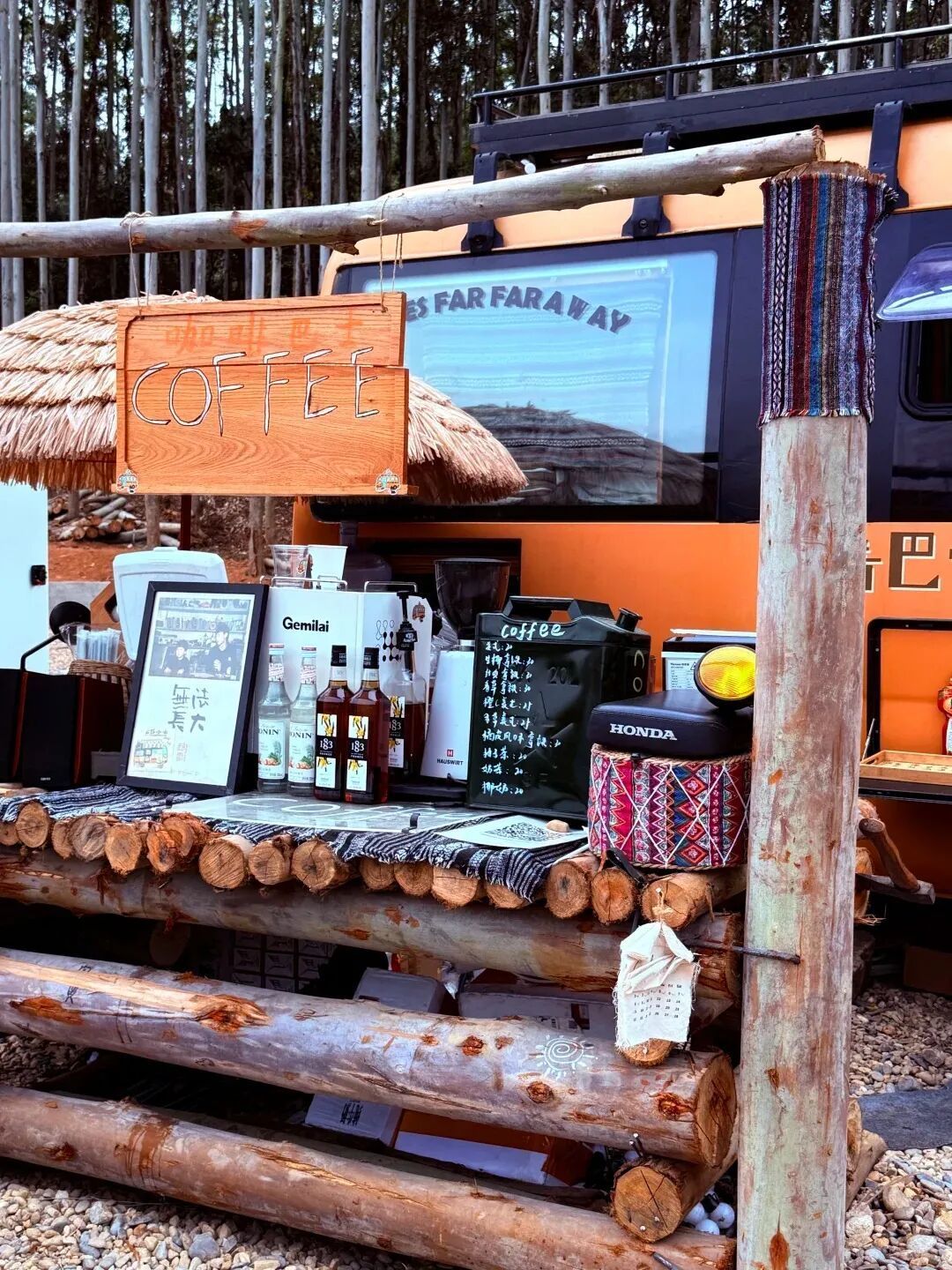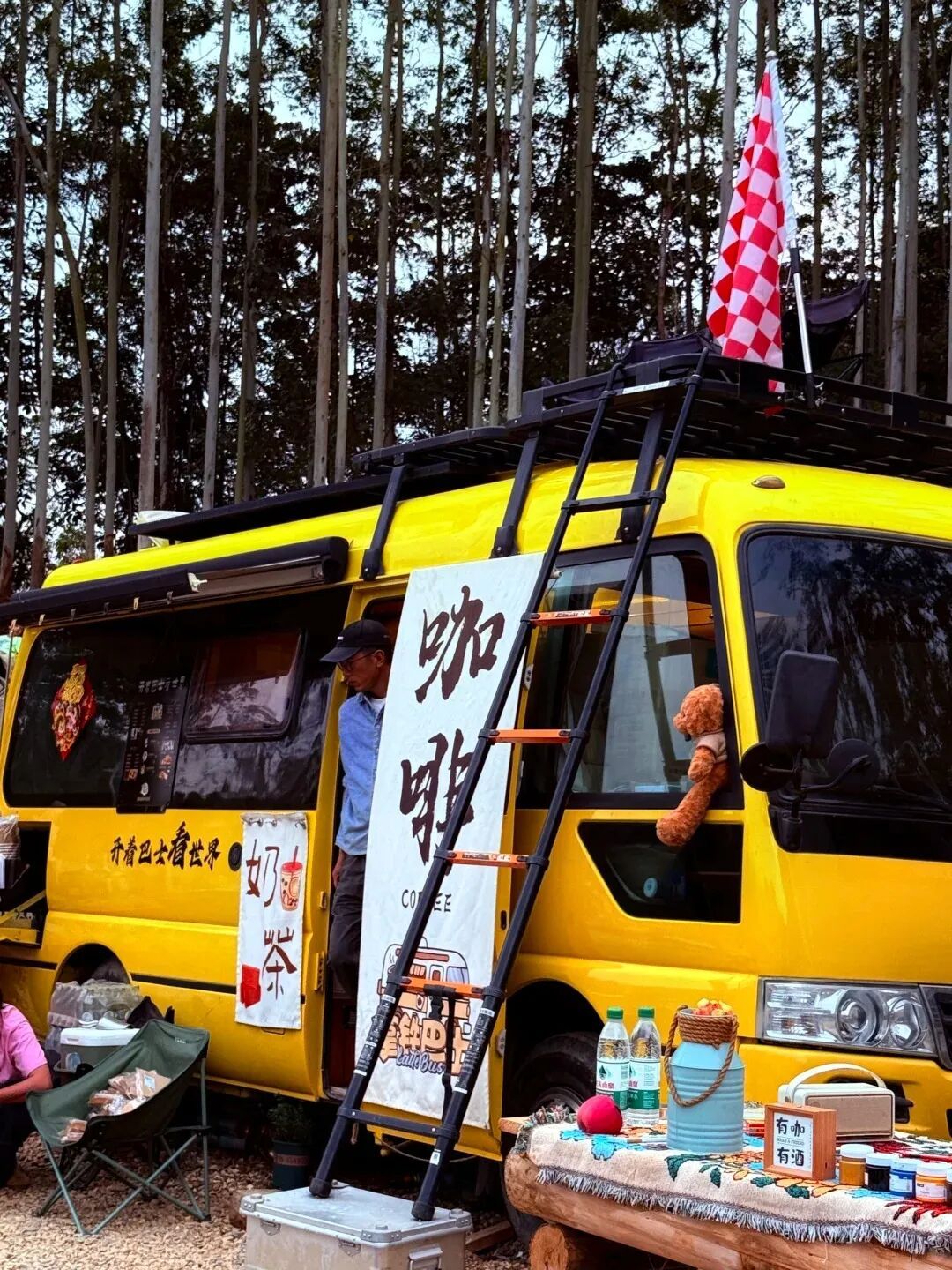 蓝天白云、纯白帐篷、复古巴士