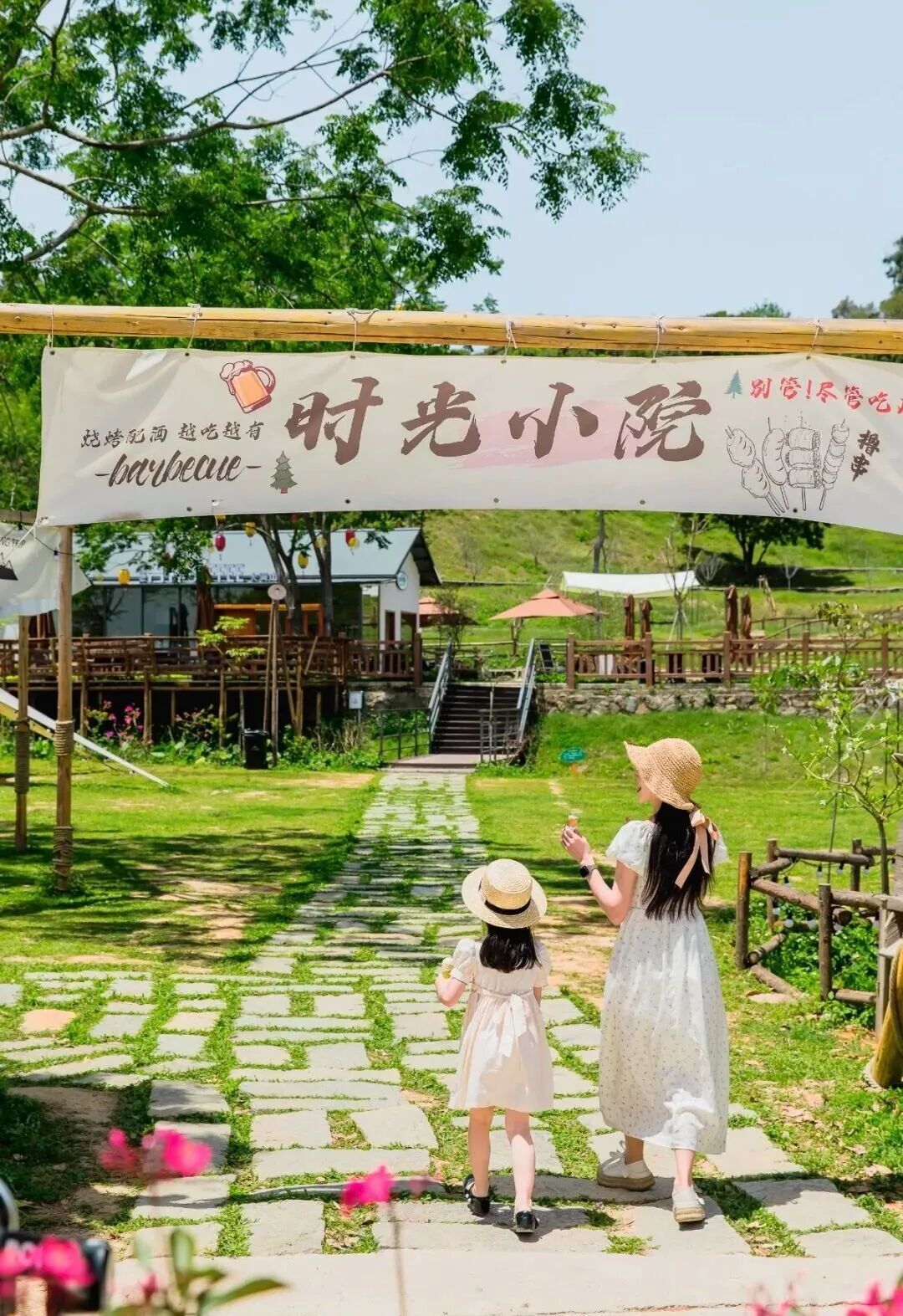 碎石步道、绿植与彩色挂旗交织成画