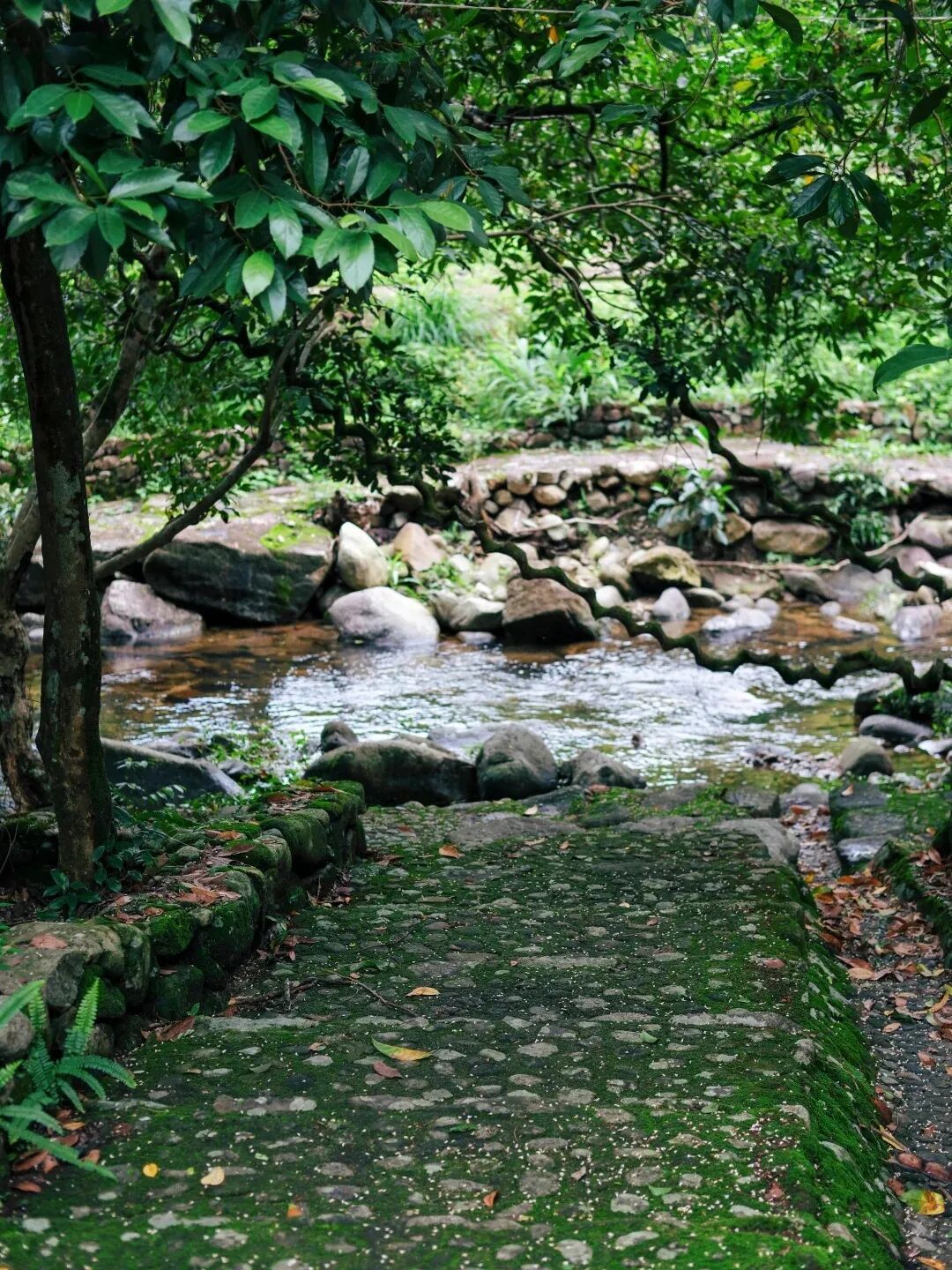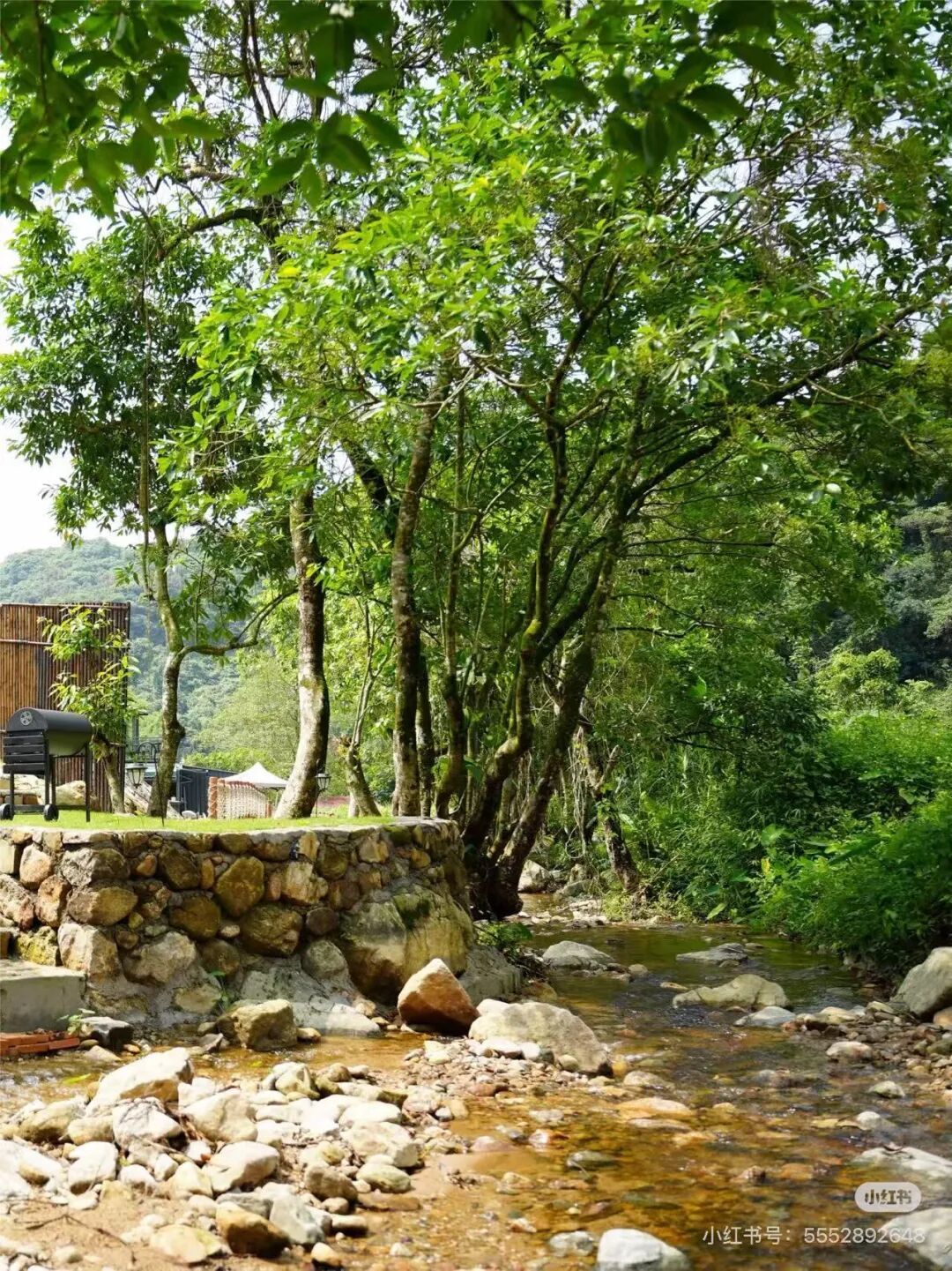 溪流平缓,树荫密布,空气清新