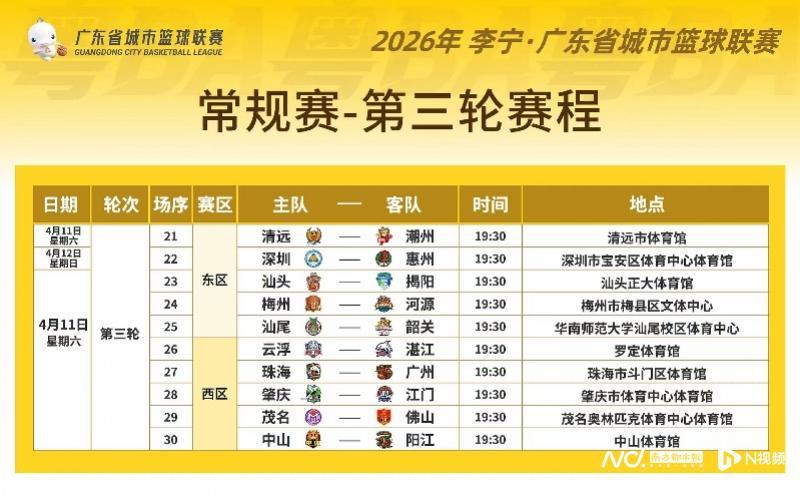 南都讯 记者汪雅云 经过清明假期休赛调整,2026年广东省城市篮球联赛(粤BA)常规赛第三轮赛事即将在本周末再次打响,本轮赛事作为常规赛中期关键节点,除了十冠王东莞队轮空外,东西区20支队伍都将全力出击,争夺积分排名主动权。
